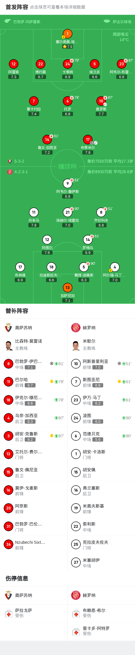 随着比赛继续进行,奥萨苏纳继续保持着压倒性的优势,对赫罗纳的门前形成了持续的威胁。在第79分钟,布季米尔再次展现出了自己的进球能力,他接到队友的传球后,成功将球送入了对手球门,扩大了奥萨苏纳的领先优势。场面一度一边倒,赫罗纳的防线在奥萨苏纳的攻击下显得有些不堪重负。